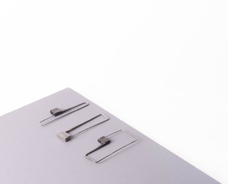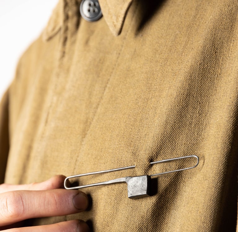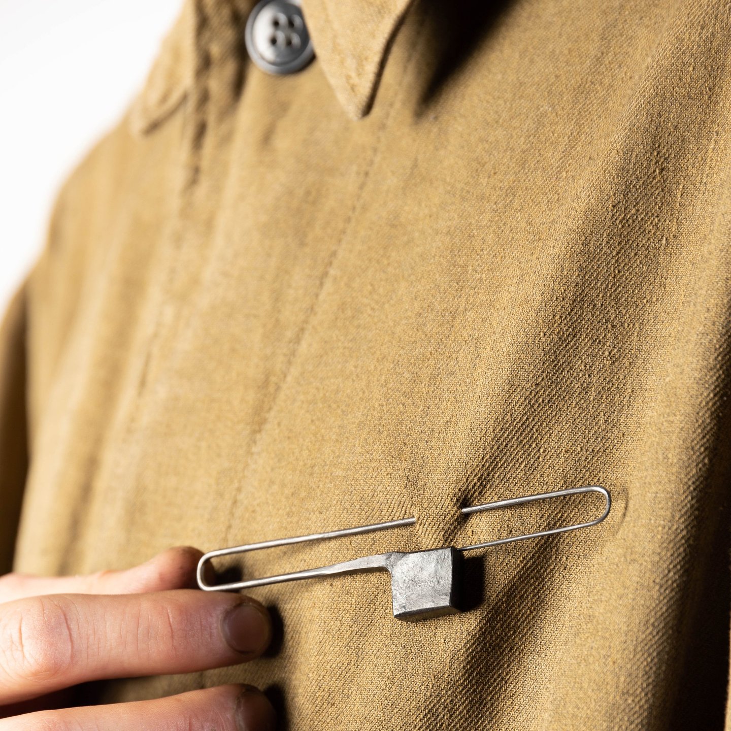 The “safety pins” are a series of brooches I made during an Erasmus exchange in Tallinn. They are forged from discarded car springs. The composition is created only with a few bends. The forged spike becomes both a functional part of the brooche and integral part of the composition.